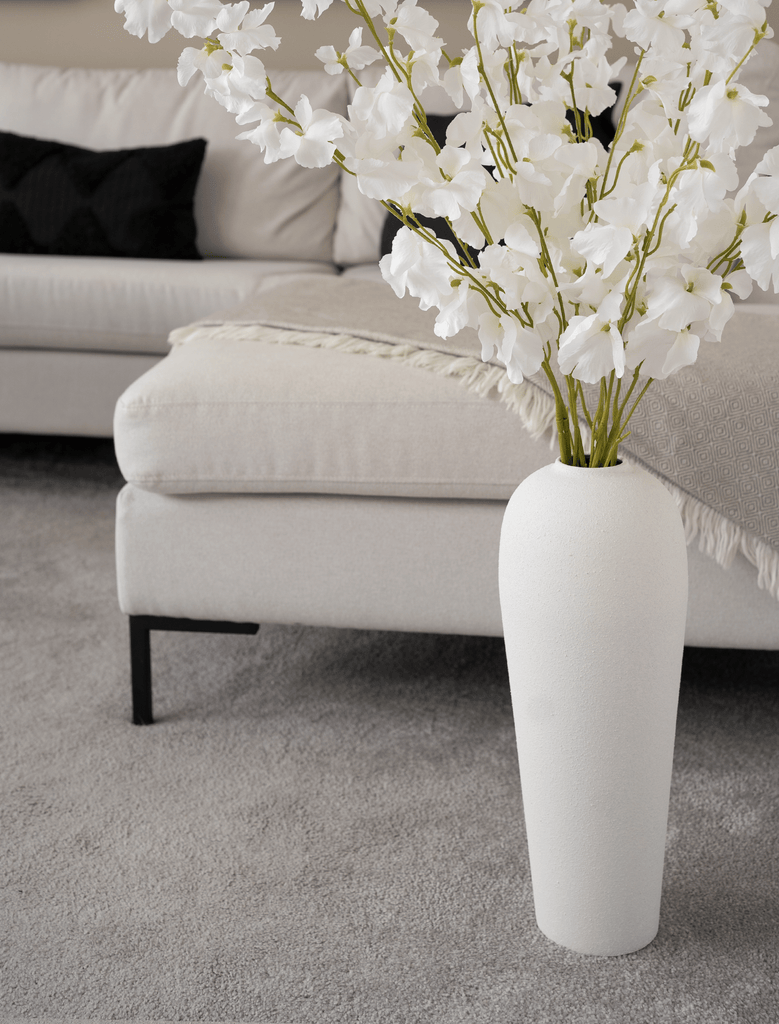 Our Tall Lola Vase is perfect for those who love a rustic, modern farmhouse style. The textured finish combined with the modern silhouette creates a unique yet versatile vase that will look good in any home.